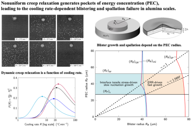 氧化铝膜在高温合金部件表面形成,是热障涂层系统抵抗高温氧化和腐蚀的核心屏障。然而,该膜层在服役后冷却至室温时,常在特定条件下发生不可预测的剥落失效,成为限制航空发动机等高端装备寿命与可靠性的瓶颈问题。以往研究虽观察到剥落行为强烈依赖于冷却速率,但其内在的力学机制,特别是室温下在远低于屈曲临界值的压应力状态下自发形成裂纹并扩展的现象,长期未能得到合理解释。袁博副教授与英国拉夫堡大学Simon Wang教授团队创新性地提出了“非均匀蠕变松弛”(Nonuniform creep relaxation)诱发“能量聚集区”(Pockets of Energy Concentration, PECs)形成的核心理论。研究团队建立了严谨的解析力学模型,首次将冷却速率相关的残余应力演化与非均匀蠕变动力学定量耦合,成功解释了早期经典实验观察到的关键现象(如冷却速率窗口效应、基体厚度效应),其预测的剥落尺寸与实验测量结果高度吻合。本研究提出的“能量聚集区”模型和“鼓泡相图”理论框架,为理解和预测热障涂层氧化铝膜的失效提供了全新的力学视角。